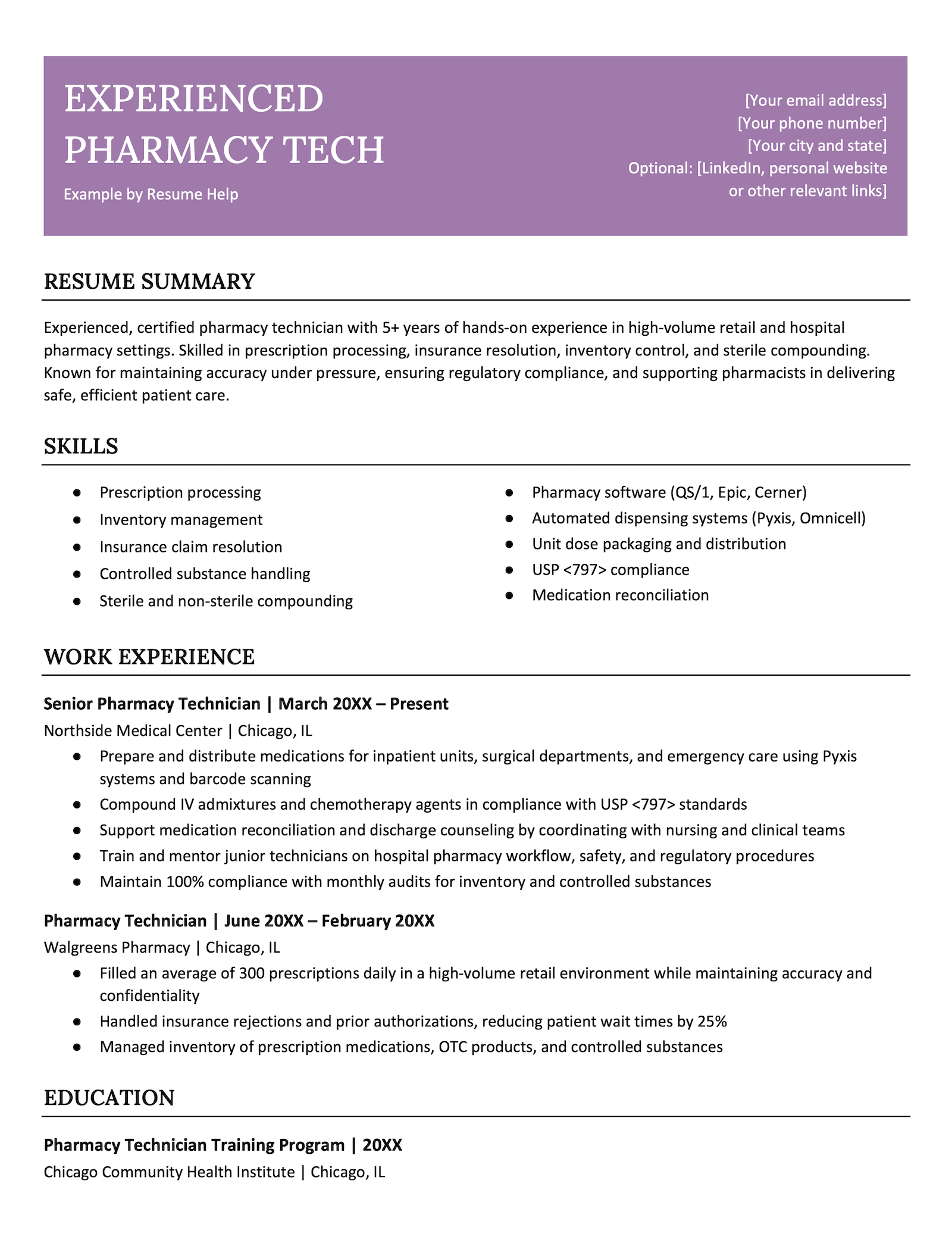 If you’ve been working in a pharmacy for a few years, your resume should reflect your growing expertise. This experienced pharmacy technician resume example shows how to highlight your skills, certifications, and accomplishments to stand out.